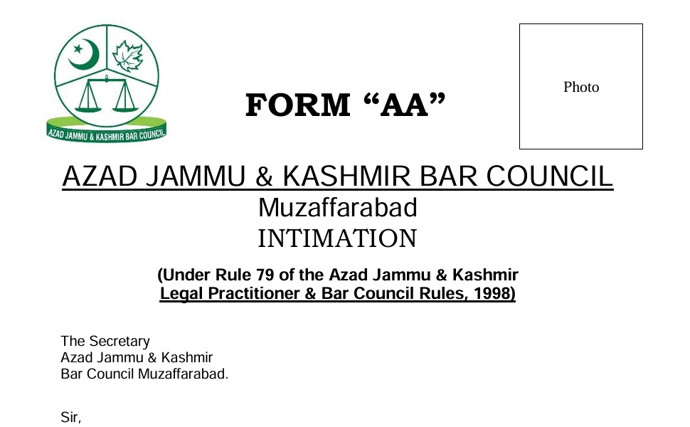 under the Azad Jammu & Kashmir Legal Practitioner and Bar Council Rules 1998, do hereby intimate you accordingly. I hereby enclose the following documents in the support of this intimation. i. Attested Photocopy of the LLB Result Card. OR LLB Provisional Certificate or LLB Degree. ii. A Slip of RS. 5000/- deposit the HBL Bank Chatter Branch of the Collection A/C No. 11650006130703 of the Azad Jammu & Kashmir Bar Council, as intimation fee. iii. Attested Copy of State Subject and NIC. Your’s obediently